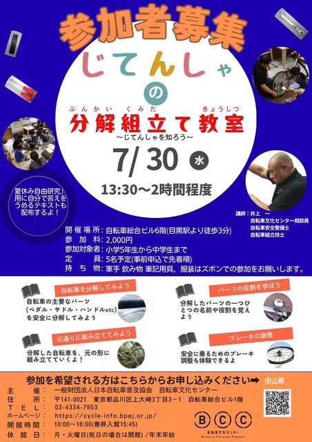 ※終了しました!】自転車文化センター 夏休み「自転車の分解組立て教室 ~じてんしゃを知ろう~」開催のご案内<7月30日(水)13:30~>
