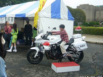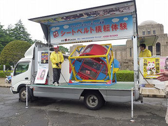 白バイに乗っての記念撮影は、子供にも大人にも大人気。シートベルトコンビンサーは自動車の横転事故時にシートベルトがどのように働くか体験できる装置です。