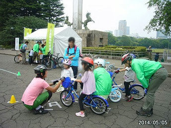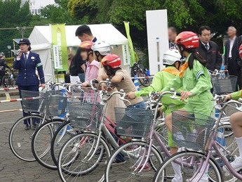 ピーポ君と一緒に自転車安全利用五則を学んだあとは、特設コースで自転車乗り方教室を開催。