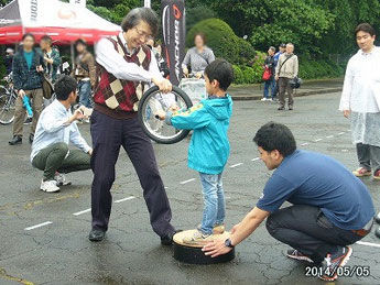 走っている自転車が倒れない仕組み“ジャイロ効果”を体験。