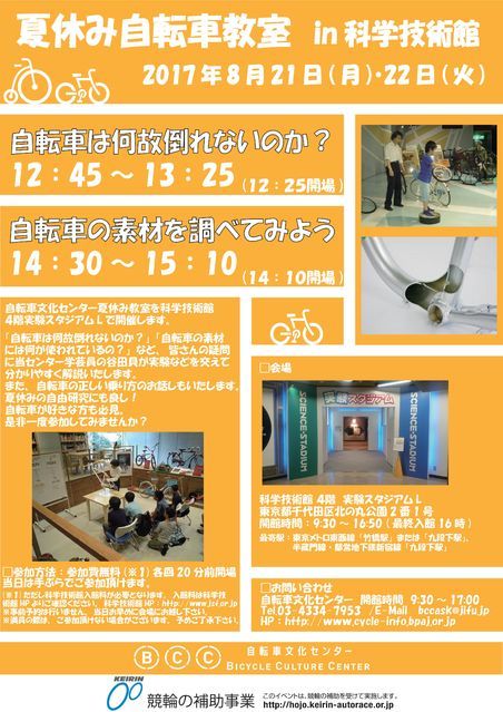 自転車文化センターでは、千代田区北の丸公園にある科学技術館で、「夏休み自転車教室」を開催いたします。「走っている自転車は、なぜ倒れないの?」「自転車はどんな素材で出来ているの?」といった、身近な自転車への疑問を実験や体験を通じて学ぶことが出来ます。講師は、当センター学芸員の谷田貝が務め、みなさまに分かりやすく解説します。自転車を題材に夏休みの自由研究にしてみてはいかがでしょうか?また、自転車の正しい乗り方についてもお話しいたします。