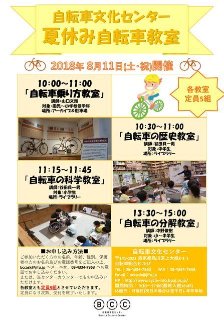 今年も自転車文化センターでは、夏休み自転車教室を開催いたします。 「自転車のことをもっと知りたい!」 「夏休みの自由研究にしたい!」 「なんだか楽しそう♪」 そんなみなさんのご参加をお待ちしております! ※※※【お知らせ】「自転車の歴史教室」は、大人の方もお申込みいただけます。※※※