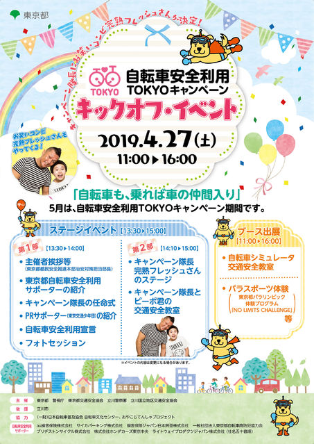 東京都では、社会全体で自転車の安全利用を推進するため、5月を「自転車安全利用TOKYOキャンペーン期間」とし、交通ルール・マナーを都民の方に周知し実践していただくため、区市町村、警察及び関係団体と連携して、様々なイベントを実施しています。キャンペーンに先駆け、特に、普段、交通安全教室等に参加する機会が少なく、 自転車交通事故のうち約3割を占める30、40代を中心に、その子供や親も含めたファミリー層の方に「自転車の安全利用」を考えていただくめ、キックオフ・イベントを実施します。本会も協力しております!