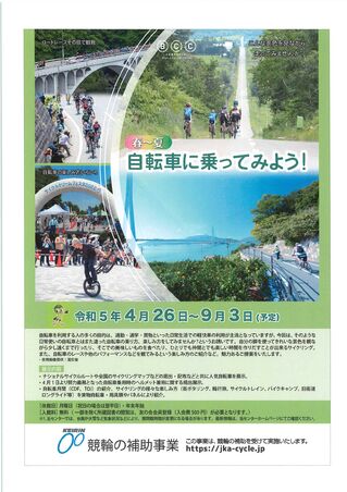 日常使いの自転車とはまた違った自転車の乗り方、楽しみ方をしてみませんか?というお誘いです。自分の脚を使ってきれいな景色を観ながら少し遠くまで行ったり、そこで美味しいものを食べたり、ひとりでも仲間とでも楽しい時間を作りだすことが出来るサイクリング。また、自転車のレースや他のパフォーマンスなどを観てみるという楽しみ方のご紹介など。魅力あるご提案をいたします。