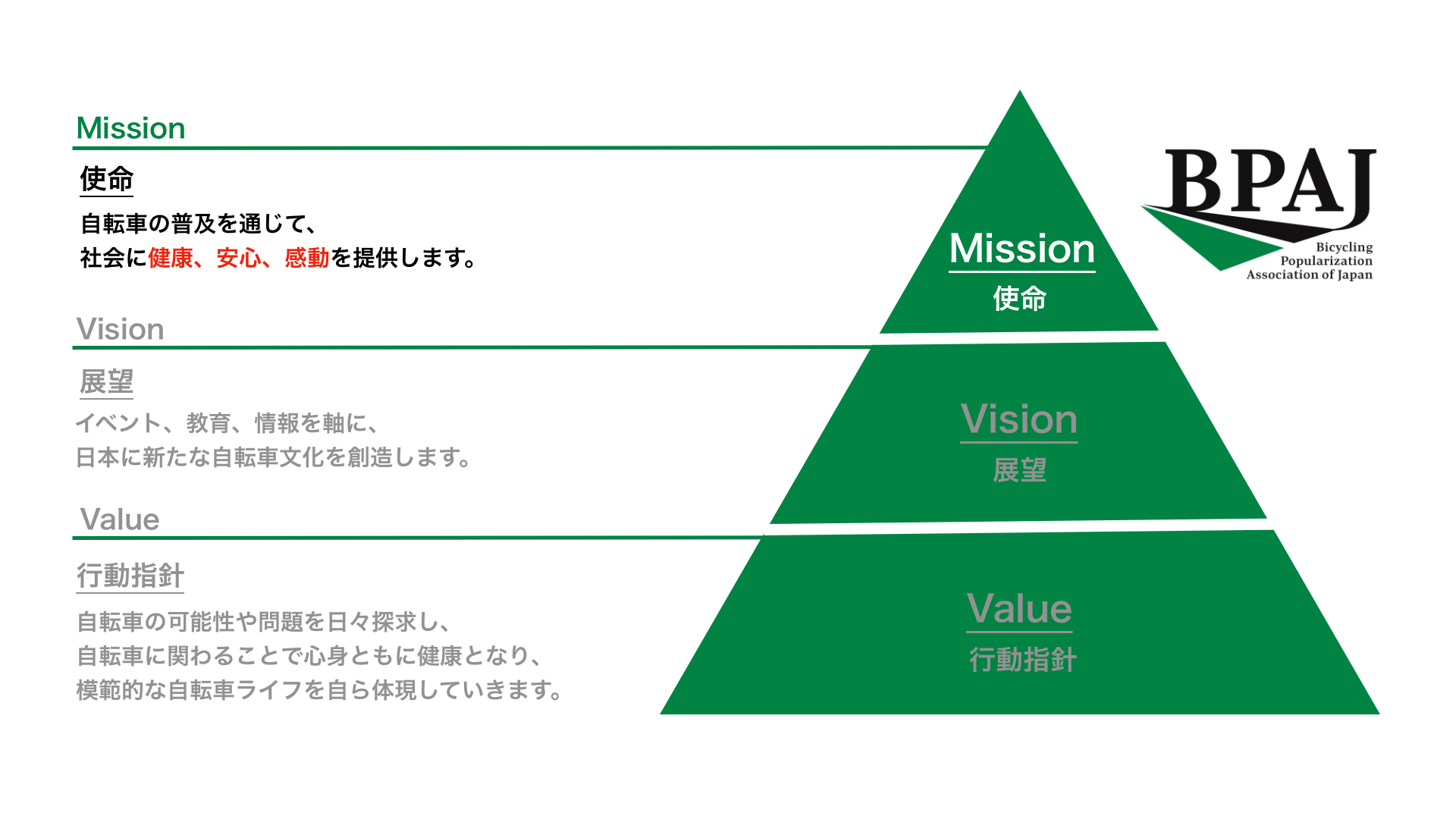 BPAJ|MVV|Mission(ミッション) 『自転車の普及を通じて、社会に健康、安心、感動を提供します』